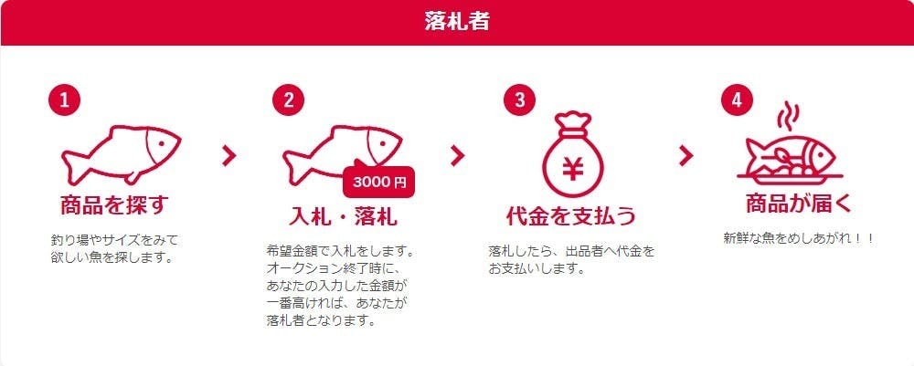 魚のオークションサイト ”Fish Sale” です。 Fish Saleは、釣った魚を その場で出品 して、 欲しい時に 欲しい人に届ける 魚専門のオークションサイトです。 出品者のメリット 手早く 簡単に 出品可能! 魚の写真を撮ります。 商品名やサイズなどを入力します。 それだけで出品できます。 出品は もちろん 無料! 会員登録料・ 月会費・カード手数料は 一切かかりません。 落札者のメリット 新鮮な 魚が.