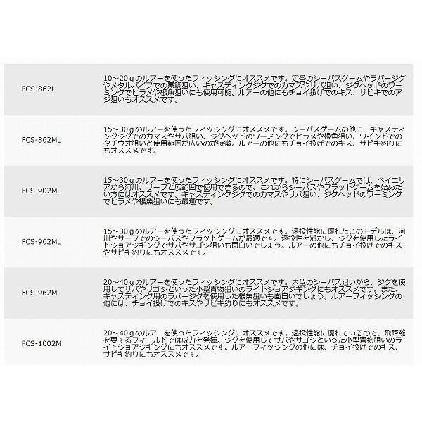 Major Craft First Cast Sea Bass & Casting model FCS962ML From Japan 5 out of 5 stars (1) 1 product ratings Major Craft First Cast Sea Bass & Casting model FCS962ML From Japan C $226 Free shipping Major Craft First Cast Sea Bass & Casting model FCS862ML From Japan. スタイル FCS962ML Amazonで購入 今まで海外で購入した トラウトロッド(グラファイト)のモノを使用していたので、全く軽いですね。 扱いもロッドに触った事ある人なら問題無いです。. FCS962ML It is recommended to fishing using the lure of 15 ~ 30g It is also recommended for Shore jigging of small fish using a jig and using a rubber jig for casting would also be interesting Besides lure fishing this rod is also suitable for bottom fishing with sabiki Specifications Length 9'6" ft/ 293mt Lure(gr) 1030 Line(lb) 814.
